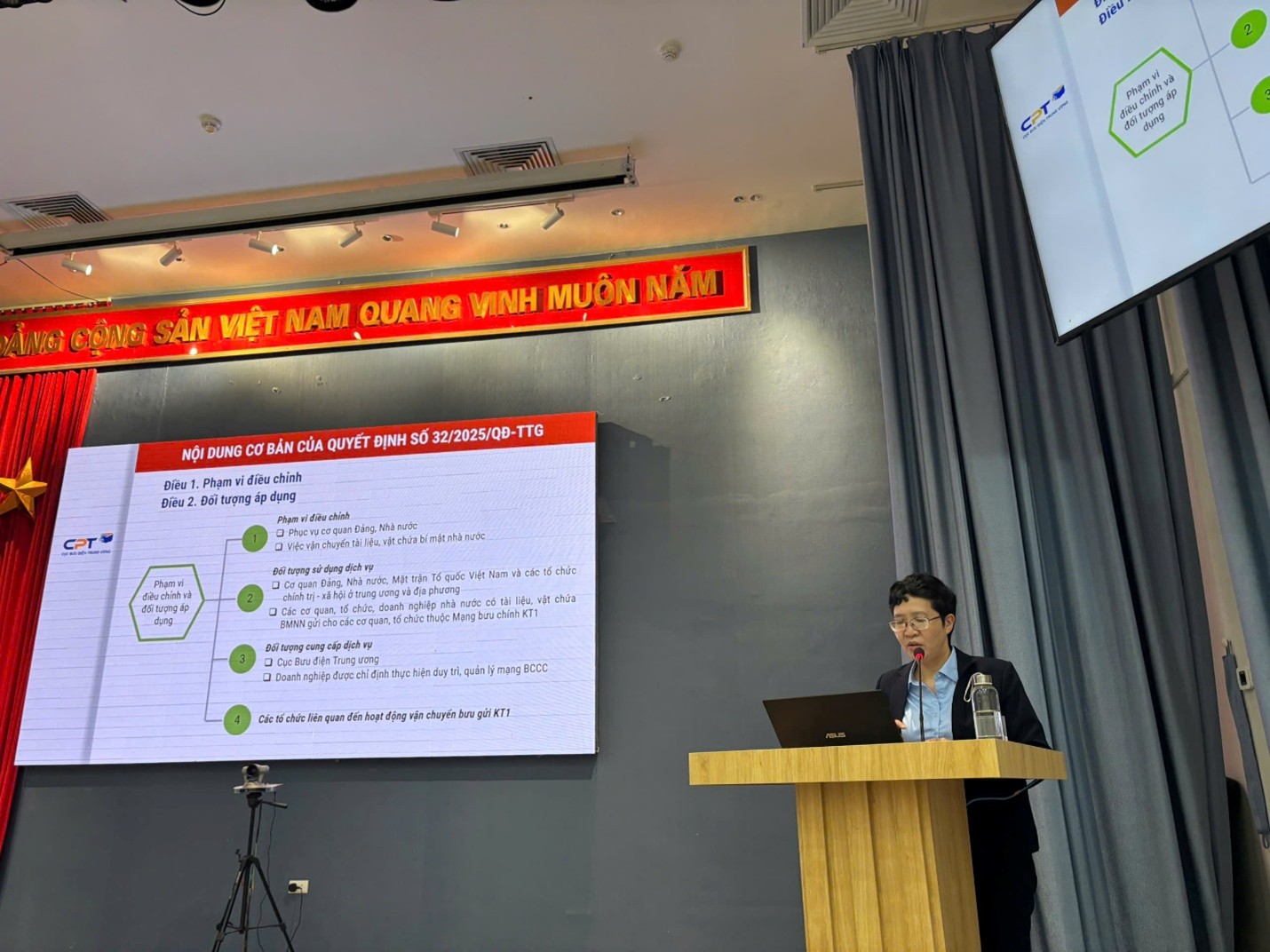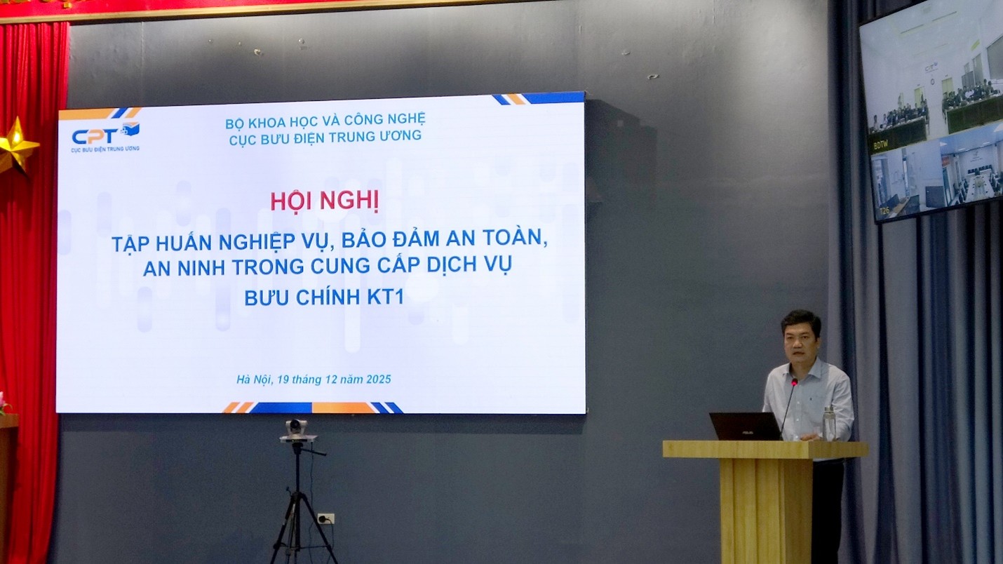 Nhằm chủ động nâng cao chất lượng nghiệp vụ, tăng cường kỷ luật, kỷ cương và bảo đảm an toàn, an ninh tuyệt đối trong cung cấp dịch vụ bưu chính KT1 phục vụ cơ quan Đảng, Nhà nước, đặc biệt để chuẩn bị phục vụ Đại hội đại biểu toàn quốc lần thứ XIV của Đảng. Sáng ngày 19/12/2025, Cục Bưu điện Trung ương tổ chức Hội nghị tập huấn nghiệp vụ và công tác bảo đảm an toàn, an ninh trong cung cấp dịch vụ bưu chính KT1 cho toàn thể cán bộ, công chức, viên chức và người lao động tham gia vào quá trình cung cấp dịch vụ bưu chính KT1 nhằm giúp các cán bộ quản lý và nhân viên trực tiếp cung cấp dịch vụ củng cố kiến thức, thực hiện đúng quy trình các bước tác nghiệp, đảm bảo cung cấp dịch vụ bưu chính KT1 tuân thủ các nguyên tắc bí mật, an toàn, an ninh, nhanh chóng, chính xác, kịp thời trong mọi tình huống; đồng thời nâng cao nhận thức, trách nhiệm trong công tác bảo vệ bí mật nhà nước.